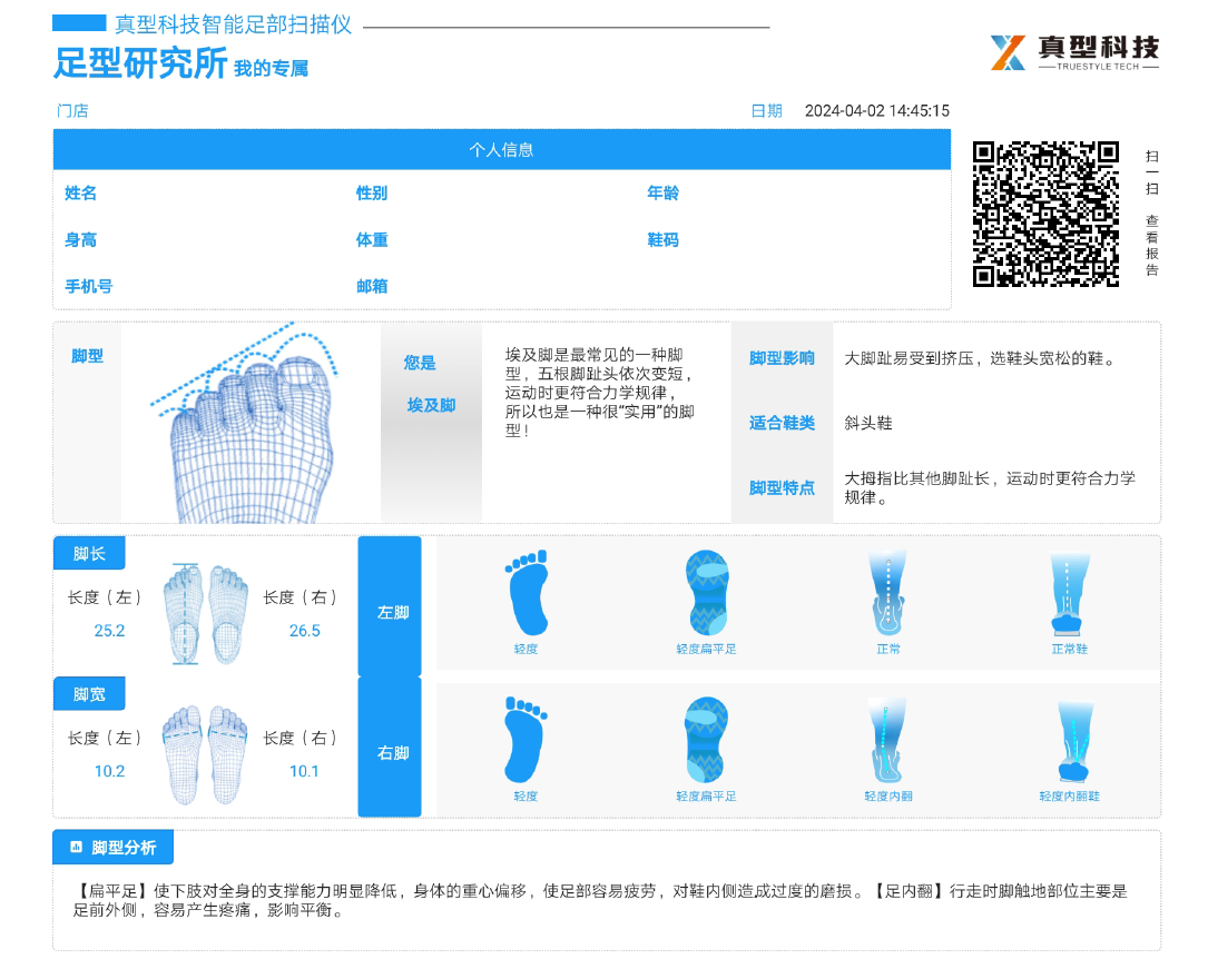 足部扫描仪可以精确扫描脚的形状和大小,为每个人提供定制的鞋和鞋垫设计。这对于那些因为足部问题(如扁平足,足部畸形)需要特殊鞋的人来说非常有用。